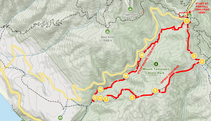 We would start at Pantoll Trailhead and hike down Steep Ravine Trailhead, looping back up Dipsea Trailhead to Old Mine Trail back to Pantoll Parking Lot.